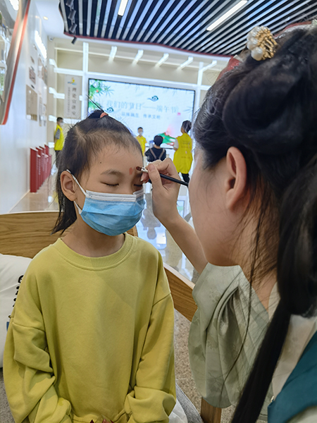 此外,海大漢服社的志愿者通過穿著不同漢服的實體模特,詳細介紹了漢服的特征,解讀了其中蘊含的文化元素和歷史淵源,讓大家對漢服有一個初步的認識,并讓在場的大小朋友們共同體驗描花鈿的傳統(tǒng)妝容造型。