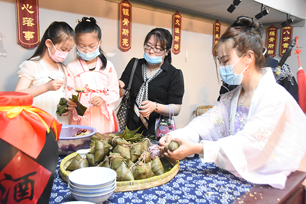 在東海社區(qū),家長(zhǎng)與孩子們齊動(dòng)手,捋粽葉、填糯米……將濃濃的民族情和端午情包進(jìn)粽子里,大家有說(shuō)有笑,活動(dòng)現(xiàn)場(chǎng)其樂(lè)融融?!拔医裉旌荛_(kāi)心,知道了端午節(jié)的來(lái)源和習(xí)俗,還在這里學(xué)會(huì)了包粽子,我打算把包好的粽子回家蒸了和爸爸媽媽一起吃?!笔バ∨笥颜f(shuō)道。