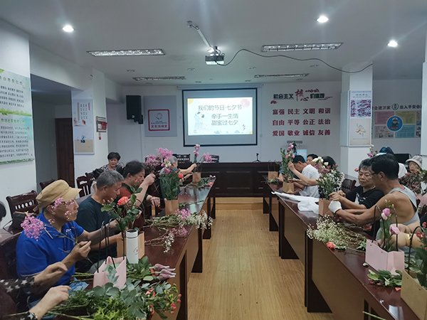 為大力弘揚(yáng)民族、時(shí)代精神,傳承中華民族優(yōu)良傳統(tǒng),過(guò)好傳統(tǒng)節(jié)日。教場(chǎng)社區(qū)組織開(kāi)展“我們的節(jié)日?七夕”主題插花活動(dòng)。