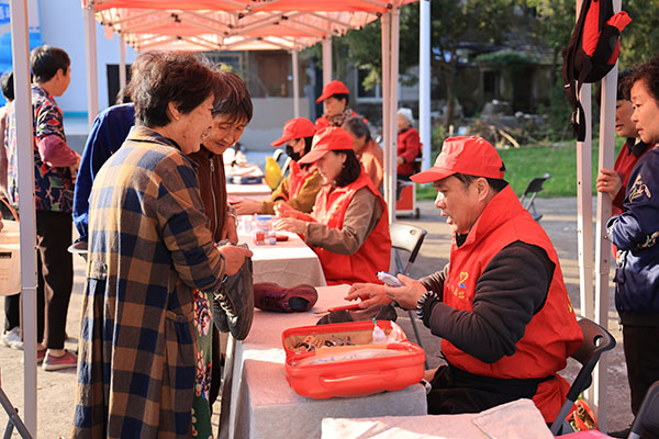 在志愿服務(wù)市集區(qū),文明實(shí)踐項(xiàng)目如約而至,理發(fā)、推拿、維修家電、量血壓、測(cè)血糖,依舊吸引了村民們前來參與。