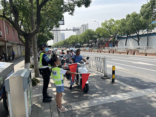 為進(jìn)一步提升轄區(qū)未成年人交通安全防范意識,普及交通安全法律知識,增進(jìn)孩子們對交警崗位的深入了解,7月15日上午,大干社區(qū)婦女兒童驛站攜手普陀交警大隊(duì)開展“浙風(fēng)十禮之行有禮”未成年人文明出行主題實(shí)踐活動。活動分為兩個(gè)環(huán)節(jié),第一個(gè)環(huán)節(jié)先由交警大隊(duì)的隊(duì)員給大家普及交通常識,在三樓的活動室里,隊(duì)員們先是給大家上了一堂理論課,就出行安全常識及常見交通信號等內(nèi)容進(jìn)行了詳細(xì)講解,并分發(fā)交警服給小朋友穿上;第二個(gè)環(huán)節(jié)帶領(lǐng)未成年人體驗(yàn)當(dāng)小交警,隊(duì)員和工作人員帶著“小交警”來到東海西路紅綠燈路口正式“上崗”,經(jīng)過之前的崗前培訓(xùn),“小交警們”個(gè)個(gè)信心滿滿,雖然天氣炎熱,但沒有一個(gè)人喊苦和累,“紅燈停,綠燈行,叔叔要等綠燈了才能走”...“叔叔,為了安全,請正確佩戴安全頭盔,扣子要扣緊”活動現(xiàn)場,“小交警們”引導(dǎo)行人、電瓶車有序通行,同時(shí)認(rèn)真檢查電瓶車主有無正確佩戴安全頭盔,認(rèn)真執(zhí)勤的他們盡職盡責(zé),充分展現(xiàn)了“小交警”的風(fēng)采。